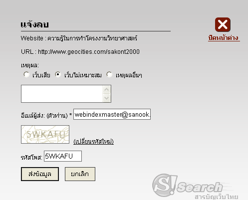 Icon แจ้งลบ - ที่อยู่ใต้รายการเว็บไซต์ หมายถึงการแจ้งลบเว็บไซต์นั้น ๆ หากพบว่าเว็บไซต์ใดไม่เหมาะสม หรือเป็นเว็บไซต์ที่ไม่สามารถใช้งานได้แล้ว ให้คลิกที่ Icon แจ้งลบ จะปรากฎหน้ากรอกรายละเอียด เหตุผล อีเมล์ผู้แจ้งลบ พร้อมทั้ง รหัสโพสต์ จากนั้นคลิกส่งข้อมูล