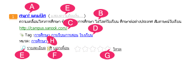 H. หมวดหมู่ แสดงหมวดหมู่ของเว็บไซต์นั้น ๆ เพื่อให้รู้ว่าเว็บไซต์นั้นอยู่ในหมวดใด และสามารถลิงค์เข้าไปดูเว็บไซต์อื่น ๆ ในหมวดนั้นได้ด้วย